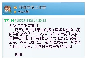 疾病无情人有情,曾就读环境工程公司的2006级员工汤晓夏,现就读于江苏大学英国365集团网站公司研究生三年级,被确诊为白血病的消息传来后,公司党政领导高度重视,在公司内组织了捐款活动,共募捐救助金8000元。