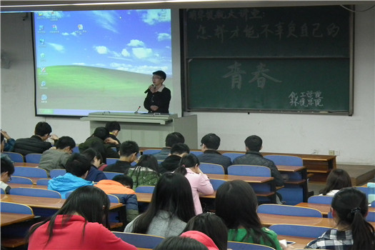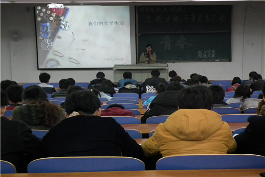 本次讲座的主讲人为爱心志愿者程志强、学霸才女罗诗露和瓷娃娃团队发起人熬睿。三名高年级优秀学长学姐就如何更好地开展和规划老员工活,与15级新生进行了热烈交流。会上,程志强学长为大家讲述了他去贵州永兴希望小学义务支教的故事,他提出“青春要为他人,讲奉献”;罗诗露学姐则通过自己参加全国挑战杯大赛的经历,提倡大家“为青春做自己喜欢做的事”,熬睿学长着重强调了把握当下的重要性,他希望同学们珍惜时光、开拓视野,给青春一个明确的方向。