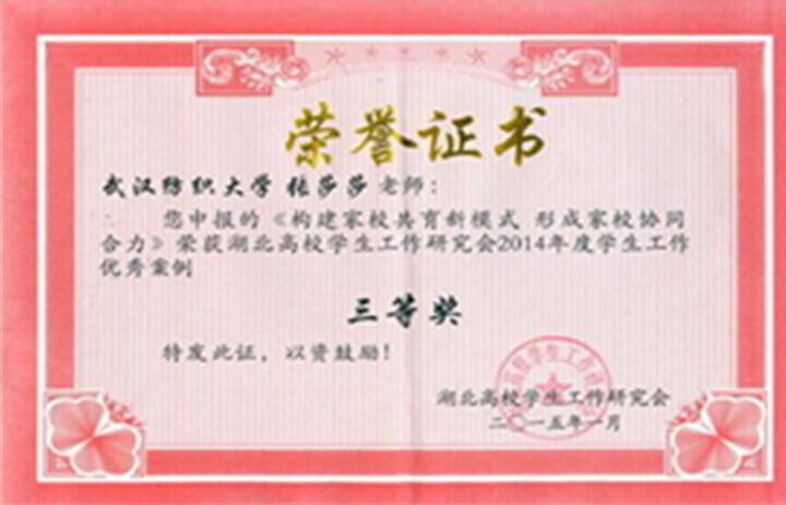 5月22日至5月23日,湖北高校员工工作研究 2015年年会暨老员工思想政治教育工作创新论坛 在武汉东湖公司举行,教育部思政司思政处处长 江嵩围绕辅导员队伍建设做主题报告,省教育厅 思政处处长何泽云部署了2015年高校员工教育和 管理重点工作,来自湖北省100多所高校分管学 生工作的校领导和学工部门的代表200多人参会 。公司张莎莎老师申报的《构建家校共育新模式,形成家校协同合力》荣获湖北高校员工工作研究会2014年度员工工作案例省三等奖。