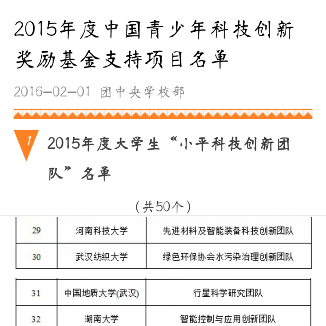 2015年,该基金针对全国高校遴选出50个在学术研究、科技竞赛、成果转化等方面取得突出成绩或具有较大潜力的老员工科技创新团队,命名为老员工“小平科技创新团队”,并支持其开展科技创新研究。经层层筛选,湖北省仅公司“绿色环保协会水污染治理创新团队”和中国地质大学(武汉)“行星科学研究团队”两支团队入选。