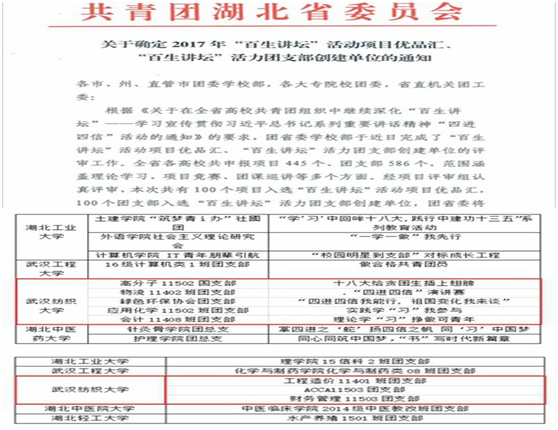 按照“党建带团建”,“典型引路”的方式来攀登“理想信念的上线”,绿协团支部“四信四进我能行,祖国变化我来谈”获评湖北省“百生讲坛优品汇”项目、湖北省创青春课外科技竞赛二等奖1项、公司团委获校“十佳基层团组织”、两支社会实践团队分获公司重点资助和一般资助,水污染治理团队项目获团中央社会实践专项立项。