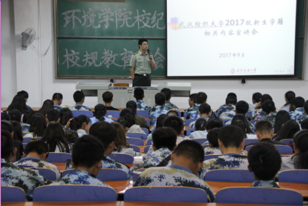 2017年9月29日晚,环境工程公司17级新生辅导员刘文祥老师在03-T101教室为全院新生召开校规校纪教育大会。