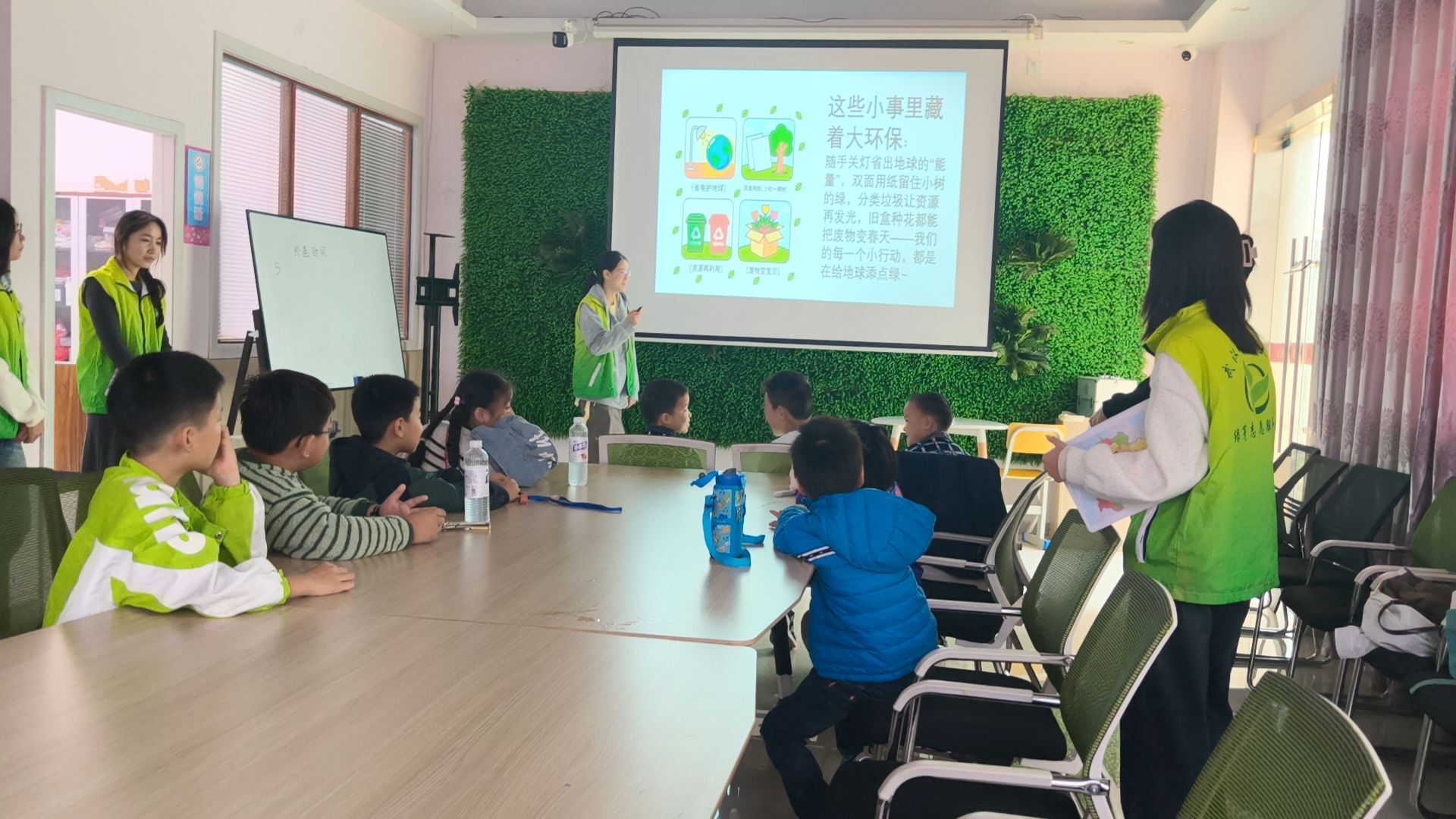 活动开始,三名宣讲人以PPT宣讲为核心,轮流用生动易懂的方式讲述塞罕坝“变身故事”:通过荒漠与林海的卡通对比图,搭配“沙漠爸爸”变“森林爷爷”的趣味表述,结合动画短片呈现三代造林人克服困难种树的历程,让小朋友直观感受塞罕坝的蜕变。随后,志愿者吴玥萱用“坚持种树的决心”“不怕辛苦的勇气”“爱护绿色的习惯”童趣解读塞罕坝精神,穿插励志小故事加深理解,并引导小朋友践行浇水护花、节约用纸、不乱扔垃圾等简易绿色行动。