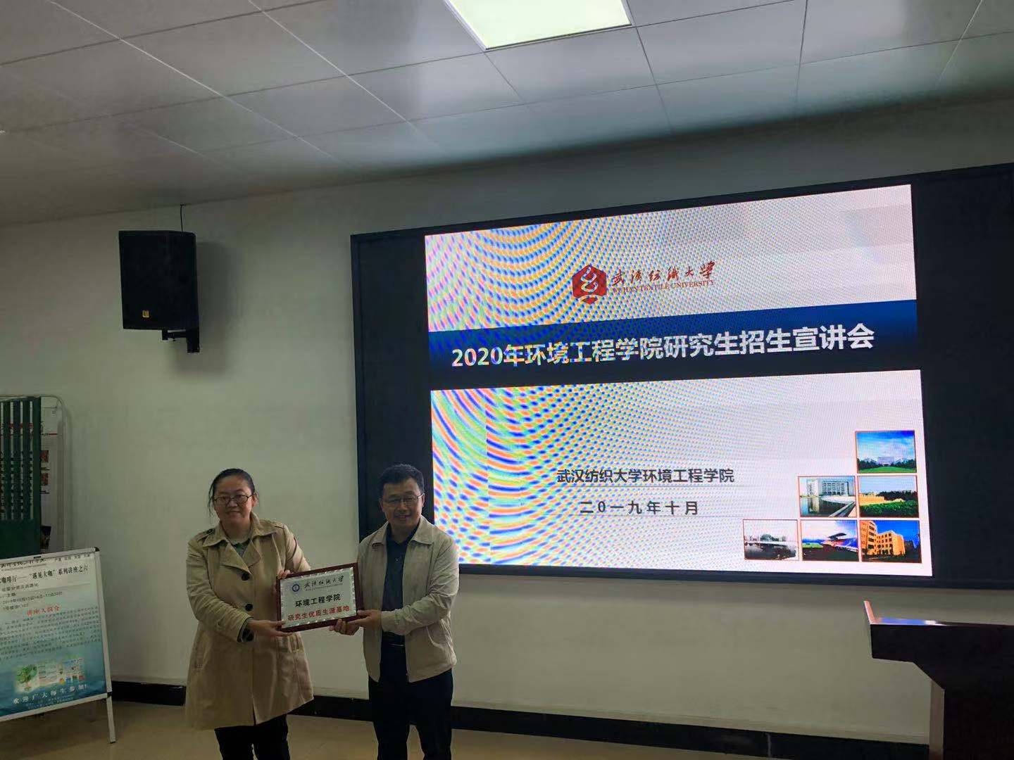 2019年10月16日,公司夏东升经理、潘飞副经理等一行赴武汉生物工程公司进行了公司2020年研究生招生宣传工作,潘飞副经理进行了招研究生招生宣讲,夏东升经理进行了公司优质生源基地授牌,并开展了毕业生回访,看望了在此工作的2012级毕业生陈欣。