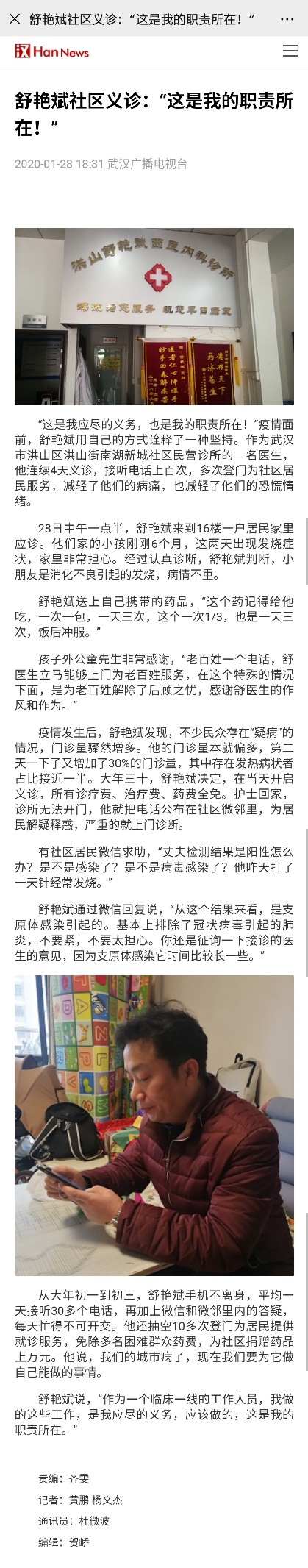 比起“舅舅”,他“医生”的形象在我脑海中更加深刻。虽然今年的年夜饭没有团圆,但是这次,比团圆的年夜饭更有意义。无数像我舅舅这样的80后,却挑起了“防疫”的大梁,我相信在武汉、在湖北、在中国更有成千上的青年医生、护士和志愿者们奋战在防疫的一线。中国,有你有我。加油中国、加油湖北、加油武汉!