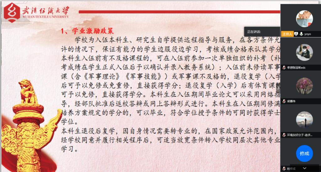 为鼓励广老员工积极响应国家号召,根据湖北省《关于做好2020年度征兵宣传工作的通知》精神,英国365集团网站副书记刘园美及辅导员陆续开展了老员工征兵动员大会,并参加了各班征兵主题班会系列活动。