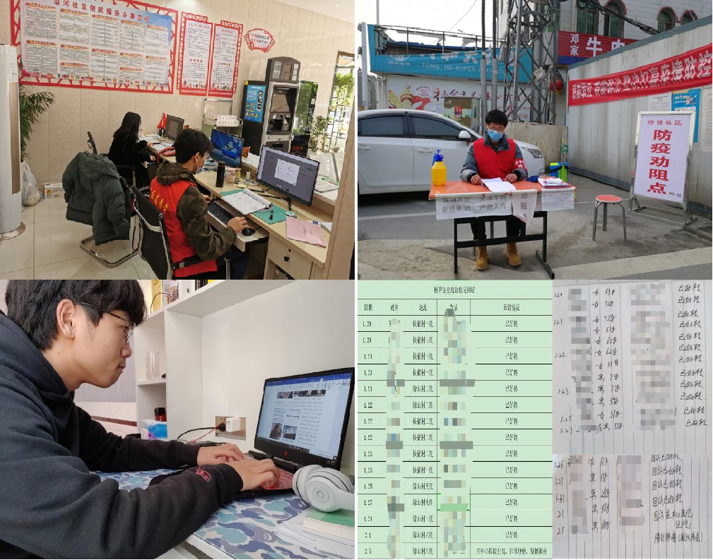 环境科学专业大一员工张思羽,在社区做志愿者一个多月,上门排查体温、宣传注意事项、组织物资团购及耐心教老人打卡湖北健康码等,忙的不亦乐乎;建环专业大一员工陈兢,持续开展线上防疫宣传,经他手审稿达50多篇无一差错;同专业大一员工贾炎璋,受同为乡村医生父母的影响,每天早早帮父母把村民的信息、病患跟进情况整理出来,做好记录和统计,在他们需要的时候快速提供;而建环专业大四员工向苗,在留意网上找工作的同时,把卡口当成了防疫战场,一干就是20多天。