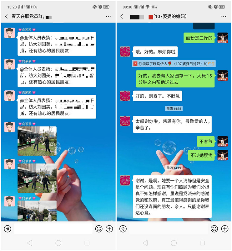 一位居民在给我留言时说:“有你们帮忙照顾老人,真不知如何感谢,感谢党和政府,但最想感谢的是你——还没谋面的朋友、亲人,只能用谢谢表达心意”。(注:儿媳在外地,婆婆80多岁一人在此居住)