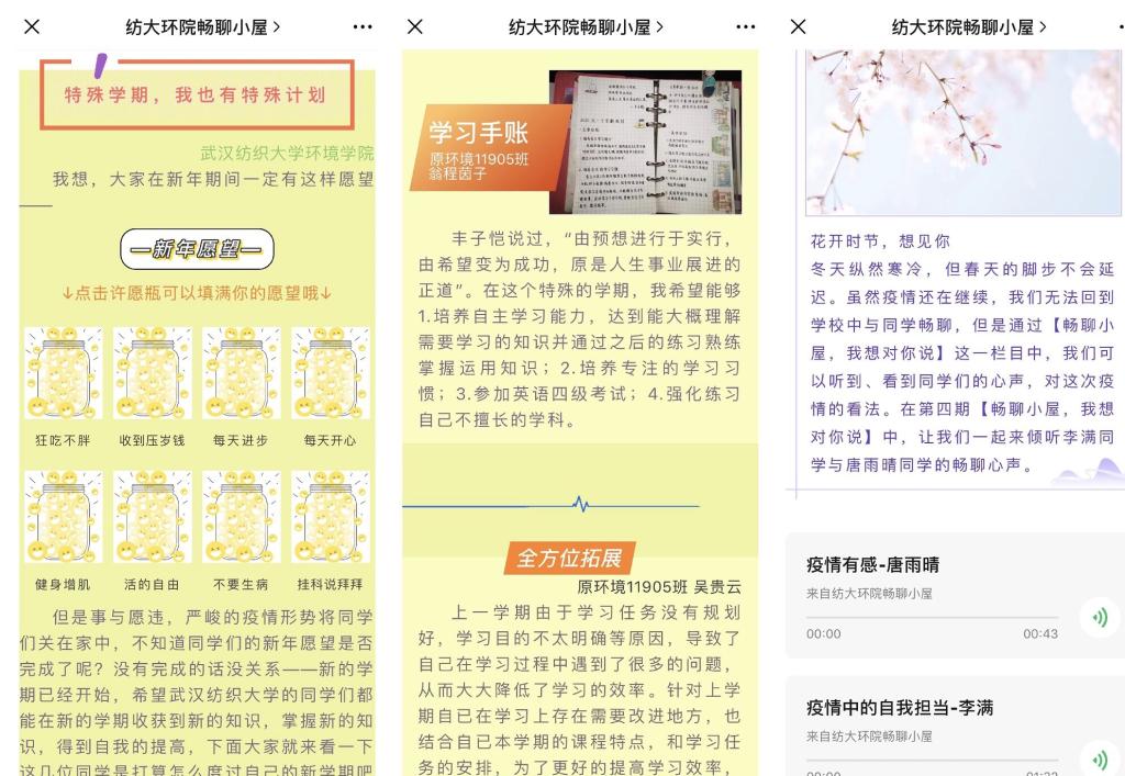 疫情期间,心理二级站围绕3.25心理健康日开展了居家抗疫“五大特色活动”,一是“畅聊小屋,我想对你说”,通过配乐朗诵的方式将疫情期间自己的感想、学习心得等向小屋分享,打造“云树洞”,同学们纷纷表达了对 “舍小家为大家”的一线人员的敬佩和感激;二是“特殊学习计划”征集,各年级同学根据不同的学习要求制定疫情期间的学习计划,规划好居家学习生活;三是《有暖风在心中,春暖花开终有时》抗疫征文,用自己的视角讲述身边人英勇抗“疫”的事迹;四是“居家抗疫读书会”,鼓励员工从书籍中汲取力量,分享读书心得;五是关爱困难员工“捐流量”活动,助力环境学子安心上网课。