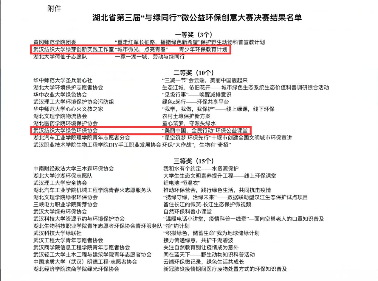 近日,湖北省生态环境宣传教育中心公布了第三届“与绿同行”微公益环保创意大赛决赛结果,英国365集团网站绿色环保协会的“‘城市微光,点亮青春’——青少年环保教育计划”和“‘美丽中国,全民行动’环保公益课堂”分别获得大赛的一等奖和二等奖。