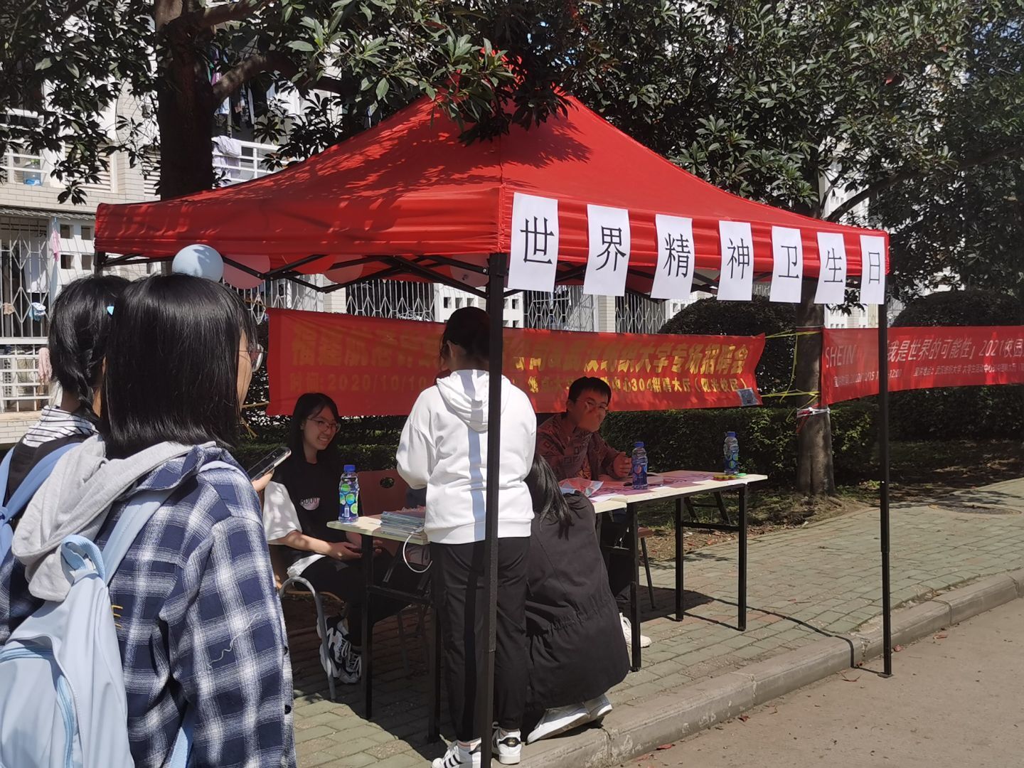 为增强同学们对2020年世界精神卫生日“弘扬抗疫精神,护佑心理健康”主题的理解,英国365集团网站心理二级站于10月10-11日在一食堂侧门开展了“弘扬抗疫精神 关注自我发展”世界精神卫生日活动,吸引了往来的同学积极参与进来。