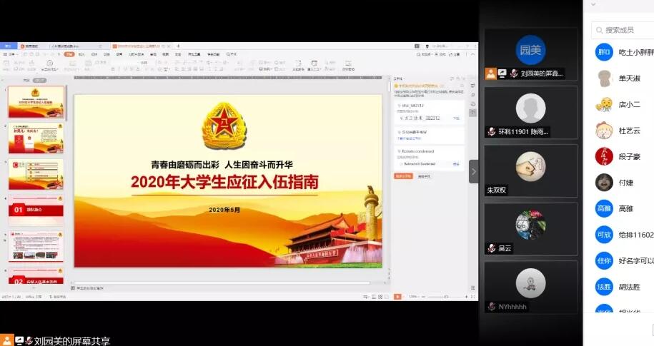 为激发老员工报名参军的积极性,提升兵源素质,推进国防和军队的现代化建设,2020年6月14日,环境公司开展了线上毕业生征兵入伍宣传讲座,讲座由刘园美副书记主讲,16级全体毕业生参加。