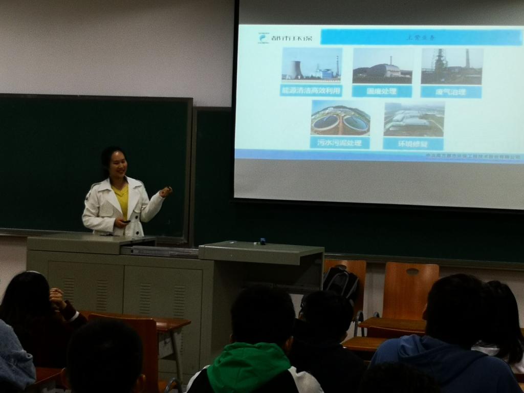 张春杰首先介绍了都市环保公司的基本状况,作为国家环保骨干企业和高新技术企业,公司以高新技术及自主知识产权为核心,集中了环境保护方面雄厚的高新技术力量、市场及人力资本优势,多项工程获评为国家重点环境保护实用技术示范工程,是行业青年成长成才的沃土。她全面系统的介绍了公司市政、工业园区污水处理,钢铁冶金全流程水处理、高浓度有机废水处理、污泥处理处置及水环境综合治理五大水务主营业务,以及正在投资、建设、运营的水务板块业务模式,以通俗易懂的语言,用典型案例与核心技术形式,分别解读了五大水务主营业务如何运转,有哪些前沿的技术,深深的打动了在场的同学们。
