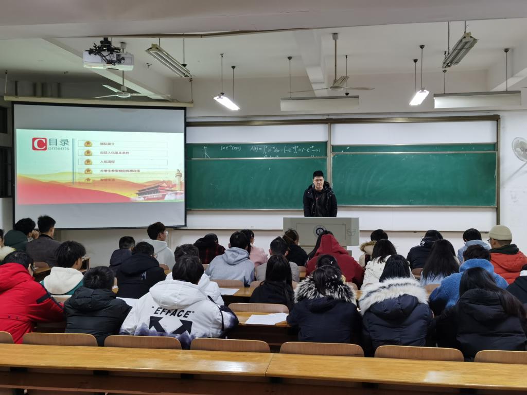 为贯彻落实国家征兵政策,进一步鼓励和引导老员工应征入伍,2021年1月10日晚,公司各年级利用晚点名机会,在崇礼楼各教室举行征兵政策宣讲会,公司副书记、各年级辅导员及班主任参加宣传。