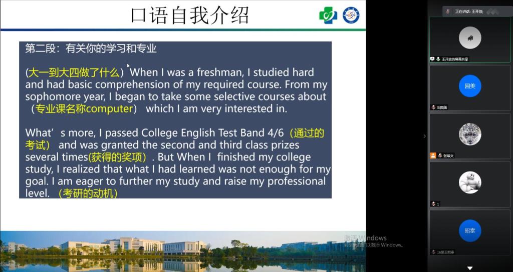 詹铭志从复试基本情况介绍、复试的核心问题及面试注意事项等三个方面为同学们答疑解惑,建议大家多方面了解不同公司的复试要求,从计划准备、条件准备、心理准备、表达准备和问题准备等方面做好复试准备、积极备考;王昭泰以自己经历为例,从远程复试设备准备、线上面试和专业面试三方面做了详细解答,建议大家做好英语自我介绍,事先进行模拟问答;王开放从复试流程、复试内容、复试注意事项、调剂注意事项等四个方面为同学们进行分享,特别要注重英语口语的前期准备,冷静思考、沉着应对,客观作答,争取取得优异成绩。