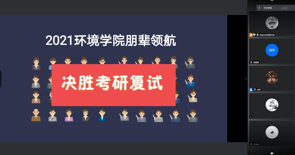 为更好地帮助考研学子进行复试准备,3月21日晚,环境公司组织开展了“决胜考研复试”的朋辈领航线上经验分享会,考取华中科技大学、南京师范大学、电子科技大学的三位学长詹铭志、王昭泰、王开放为同学们提供了针对性指导。公司副书记刘园美、辅导员刘文祥参加了会议。