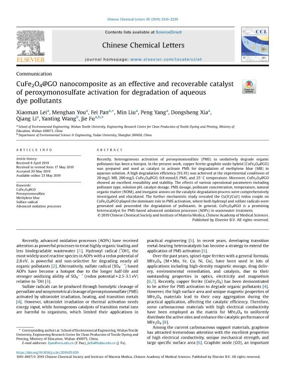 该研究采用一步式溶胶-凝胶燃烧法成功制备出具有磁性的复合材料CuFe2O4@GO,亚甲基蓝(MB)作为降解污染物;研究结果表明:在CuFe2O4@GO + PMS体系中,加入氧化剂PMS反应30min后,MB的去除率为93.4%。该材料具有磁性便于回收利用,经过5次循环重复实验MB的去除率为81.1%,且离子溶出较少。自由基淬灭实验和EPR测试表明CuFe2O4@GO +PMS降解MB体系中的活性自由基为SO4·-和·OH,且SO4·-起到主要作用;从CuFe2O4@GO反应前后的XPS测试结果可以看出,CuFe2O4@GO中的铁离子在反应前后的价态未发生改变,而铜离子在反应过程中存在价态的变化,即Cu2+-Cu3+-Cu+之间的氧化还原反应,这也是该体系PMS被活化的主要机制。该论文以英国365集团网站环境工程公司为第一完成单位,雷晓曼同学为第一作者,潘飞老师为通讯作者。
