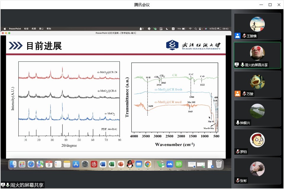周火同学介绍了其用一种碳化树脂为载体负载二氧化锰的催化剂,并对过一硫酸盐进行活化去除水体中的污染物。