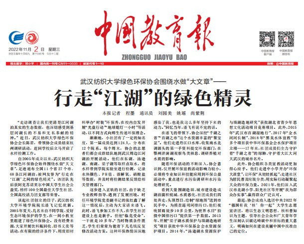 看到大量围湖造田、城市建设造成湖泊面积锐减、水质恶化,社团成员们四处奔走,头顶烈日,绘制“绿地图”送到市民手中。为摸查巡司河排污口,他们夜晚冒雨徒步10多公里,为世界水日“拍摄中国排污口”提供第一手数据。2013年,开展“梁子湖水质保护与填湖造地研究”项目获批中华环保基金会水资源保护项目。2014年,“汤逊湖水资源保护与填湖造地研究”获批湖北省青少年思想文化活动项目竞赛项目。此外,2015年“武汉市百湖湿地行”、2017年“金水河河长制”、2018年“黑臭水体宣教”等多个项目获中华环保基金会水保护项目立项……17年来,社团成员们全力守护着“千湖之省”的绿肺、守护着大江大河大武汉的城市名片。