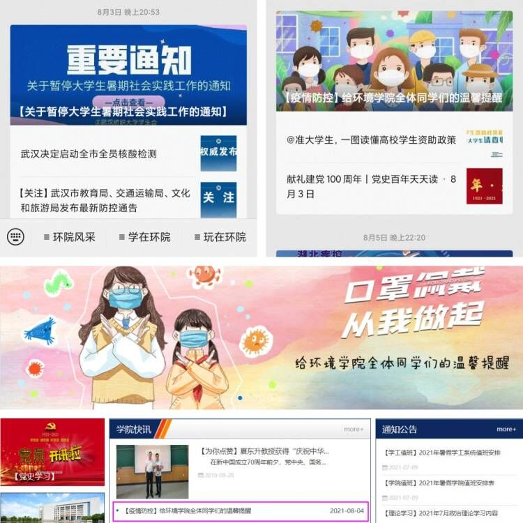 为方便同学们及时掌握疫情动态及政策精神,避免信息延误造成防控漏洞。公司充分利用网站、微信公众号等平台,每天转发全国疫情中高风险区、各级疫情防控精神,如《关于暂停老员工暑期社会实践工作的通知》《关于做好公司秋季开学前后疫情防控工作的紧急通知》等;辅导员做到每天与留校的每一位同学联系,实时掌握他们的身体状况;持续督促全院员工健康打卡,打卡率一直保持100%;引导同学们做好自身防护,不信谣、不传谣,鼓励在条件允许的情况下,以力所能及的方式开展抗疫志愿活动。