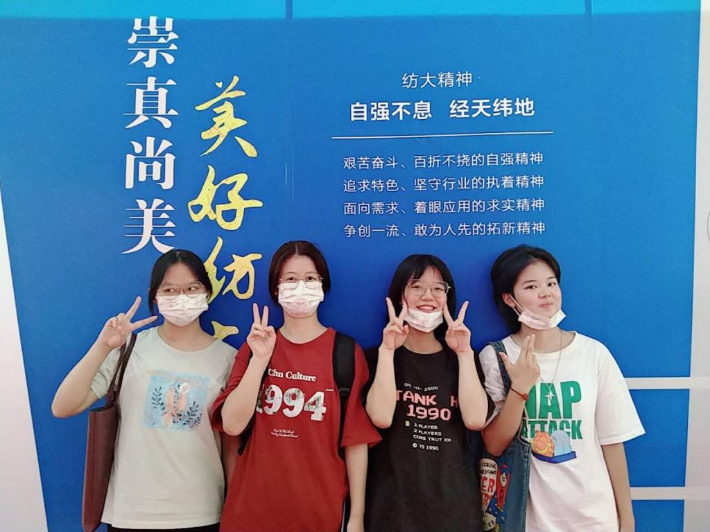 “崇真尚美,美好纺大,我们的老员工活从这里开始啦。”环境12103班王紫怡则开心的叫上室友在校训前拍照,留下与纺大的第一张合影。
