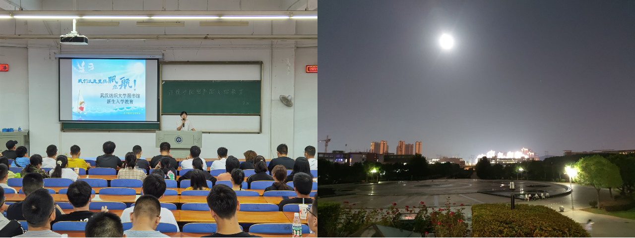 龚老师为同学们播放图书馆宣传片,生动展示了图书馆饱含人文气息的环境和丰富的资源服务。在“新生第一课”专题书架,她郑重向大家推荐具有纺大特色专业、老员工活与成长规划以及文学、哲学社会科学、自然科学类经典书籍。给排12102班张程沥晚餐后就前往图书馆参观学习,并拍下照片附言“明月高悬,美在纺大”。