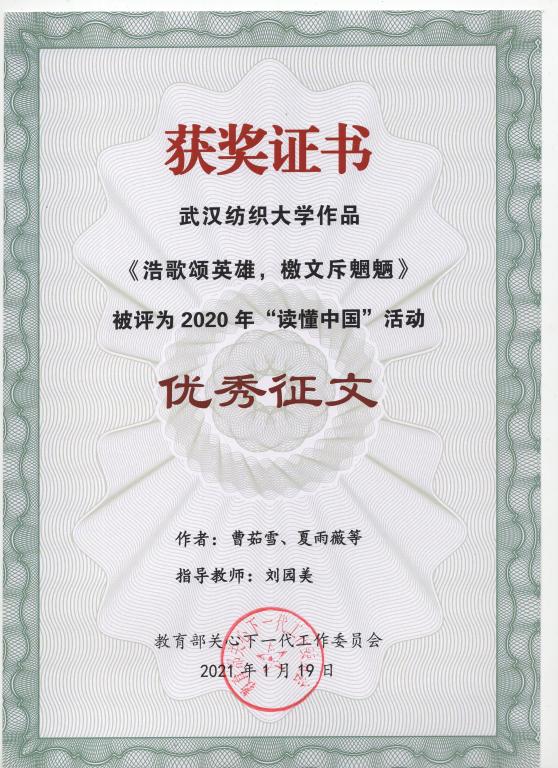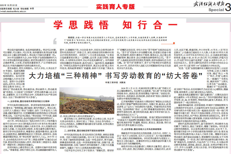 以心育心以德育德。公司把立德树人融入到思政教育、专业教育、实践教育各环节,5年来,承担省级以上实践育人课题6项,其中《美丽中国,我是行动者》和《“红色·忆思队”寻访革命前辈》分获2018、2019年湖北省实践育人重点、重大支持;3人获评优秀班主任,获得“我们爱上思政课”全国一等奖;学工人在“纺织之光”教学改革研究项目、社会实践一流课程等建设上主动融入;在中国纺织职工思政研究会奖励、第四届中国纺织类高校创意创新创业大赛、省教育厅哲学社会科学项目均取得突破,深入系统的研究转化为服务员工培根铸魂、启智润心提供支撑。