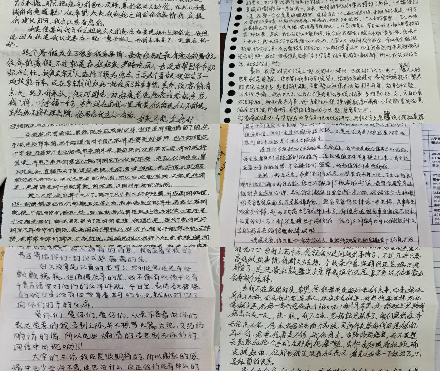 孩子的成长和感恩之心,是家长们最愿意收到的礼物,一封封满载沉甸甸思念的家书在第一时间抵达远方的家。千里之外,父母用乡音细读孩子的来信,他们亦满含深情回信,与孩子进行情感交流和心灵沟通。征得员工同意后,辅导员石伊可与同学们共读家书,“亲爱的儿子,来信已收到,我们感到十分欣慰,看到你慢慢长大我们十分的高兴。”“亲爱的宝贝,很高兴能用这种方式与你说说心里话,妈妈不善言辞,但是还是要啰嗦几句......”“女儿,你刚刚走入大学,是人生的转折点,就像车辆拐弯处,一定要站稳扶好。”