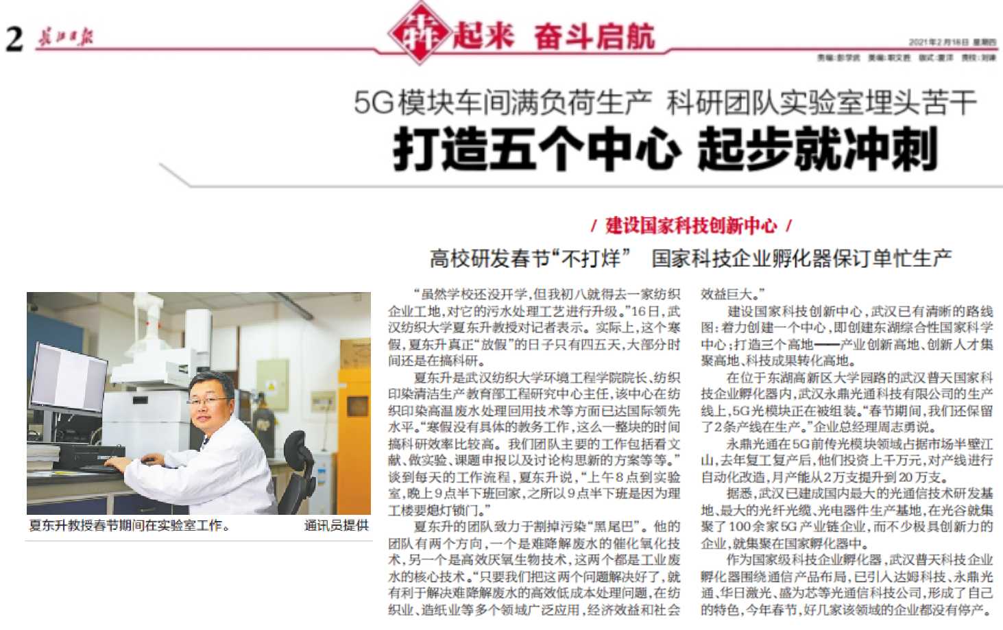 2月2日,《中国日报》以“专割污染‘黑尾巴’的产业教授”为题,对夏东升教授团队不畏寒冬、抢抓机遇、鼓足干劲科研攻关进行了报道;2月18日,《长江日报》《武汉晚报》开年第一篇“打造五个中心,武汉起步就冲刺”,以夏东升教授团队为全省高校的代表,展现出科研工作者在努力建设现代化大武汉中起步就冲刺的豪迈与担当,被省教育厅点赞“最美产业教授”。