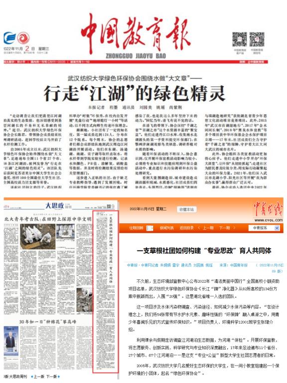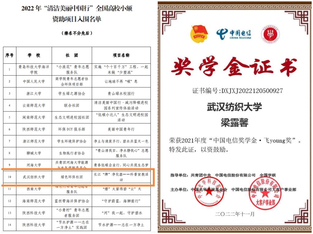 “生态启航”志愿服务队入选全国老员工生态志愿宣讲团;“绿芽”志愿服务队入选全国老员工科技志愿服务示范团队;《长江“牌”净化器科普宣教活动》入选生态环境部宣教中心 “清洁美丽中国行”全国高校小额资助项目,成为湖北省唯一;环保实践成果入选团中央“美丽中国 青春行动”社会实践成果展;环科11901班粱露馨荣获2021年度“中国电信奖学金·飞young奖”。
