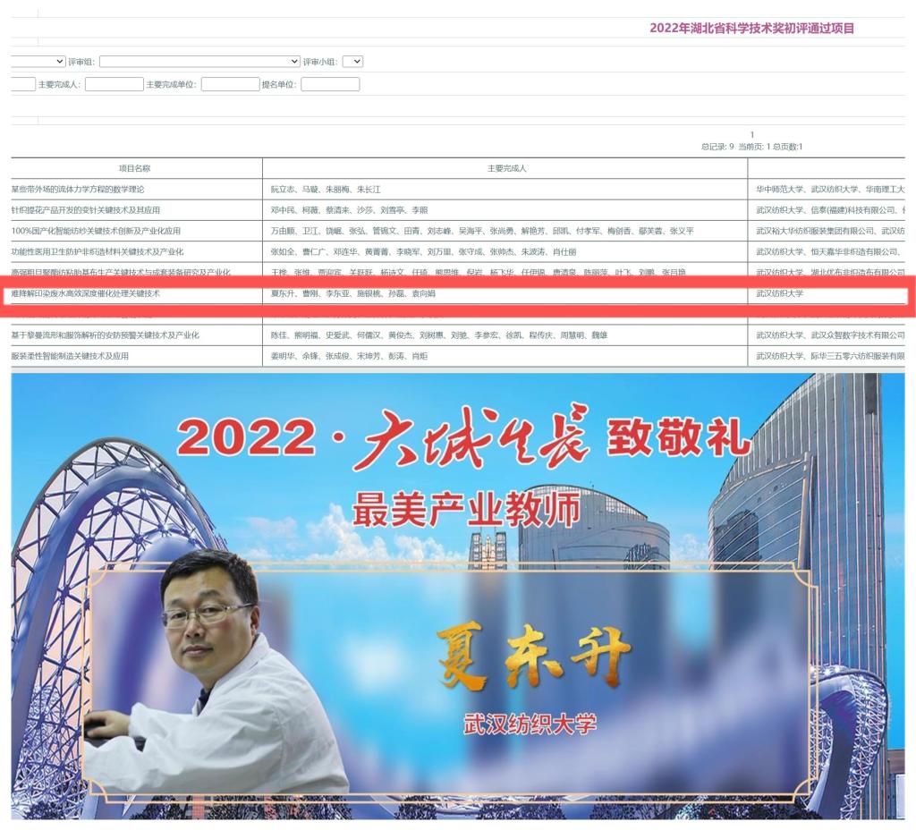 公司授权国家发明专利20项,夏东升教授成果《难降解印染废水高效深度催化处理关键技术》,申报2022年湖北省技术发明奖并通过初评;教师们深入企业、行业一线,服务地方经济科技发展,夏东升教授入选“2022·大城生长”最美产业教师推介,黄阳波博士挂职蔡甸城投环境技术有限公司副总经理。