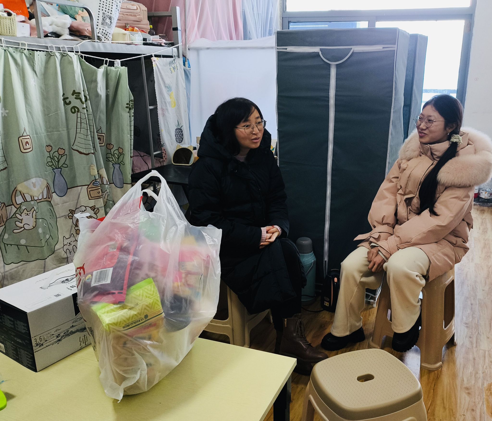 在叶同学住处,老师们了解员工实习情况和家庭困难。叶同学家庭经济困难,本学期申请了国家助学金。临近春节,家人又生病住院,所以实习结束后着急回家,但购买了多趟列车,却还是在车站等了三四个小时未能成行,只能回到住处再候补买票。姚瑶询问了员工家长病情,肯定了员工的孝顺,同时也鼓励员工总结实习经验,抓住春招机会,找到心仪的工作。并转达了公司党委对员工的关爱,送上慰问物资。员工对两位老师的到来很是感动,感受到了来自公司和公司的关心,纷纷表示会坚定信心,积极求职,将在公司所学的专业知识应用于工作实践,为社会发展贡献自己的力量。