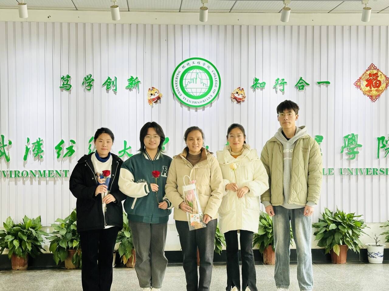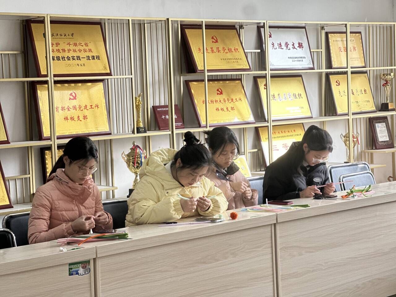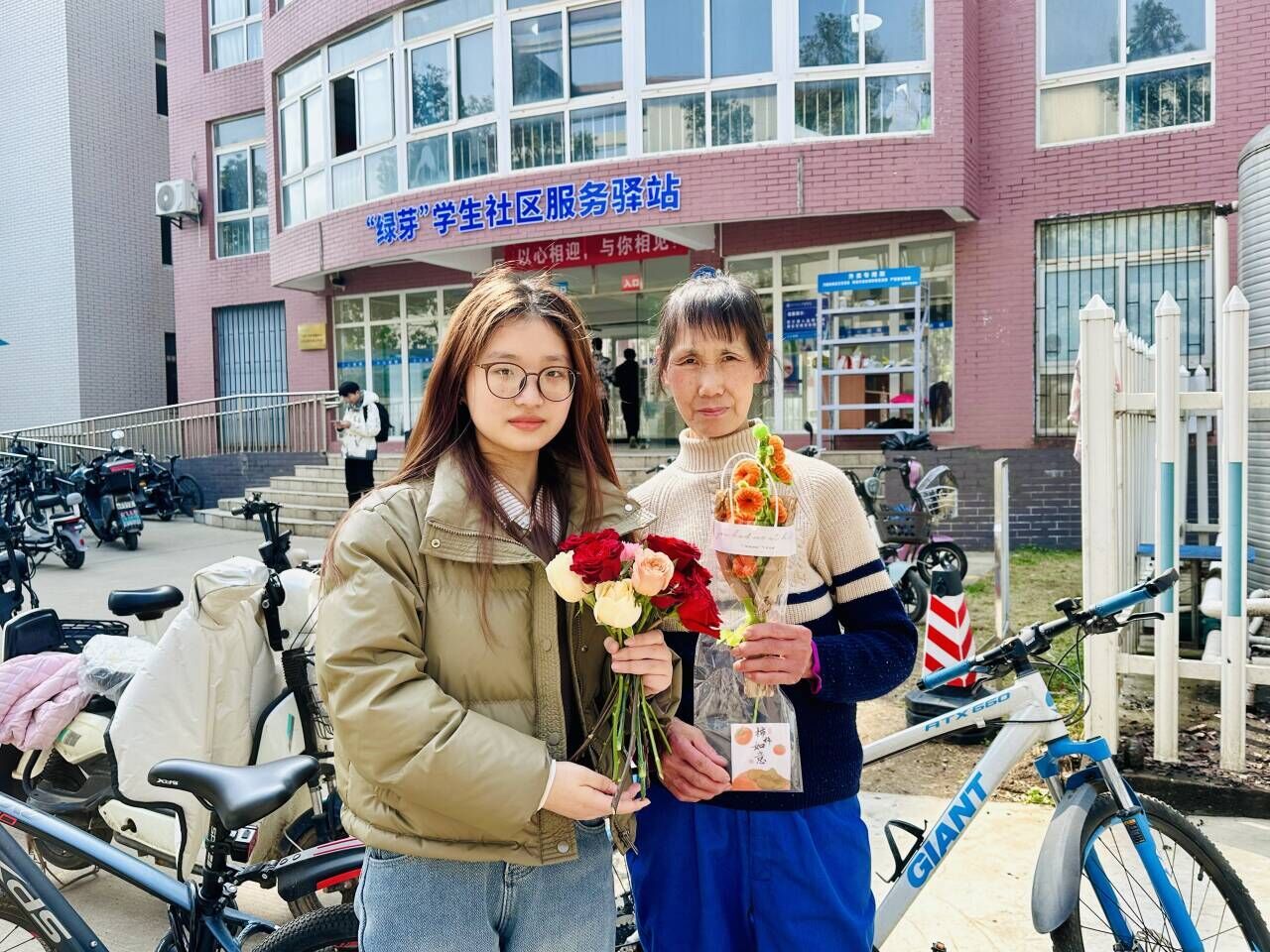 每个岗位的“她”都值得被看见,三尺讲台上的女教师、坚守到傍晚的宿管阿姨、维护校园卫生的保洁阿姨等等,都是在平凡岗位闪闪发光的女性。经过一下午的紧张制作,同学们扭出了30余种各式各样的花朵送给各岗位的女性们。“哇同学们真是心灵手巧,谢谢同学们!”10栋宿管阿姨开心的说道。“收到同学们亲手做的鲜花,我觉得非常温暖,也希望我的小女神们能学业有成,事事如意”施银桃老师分享到。