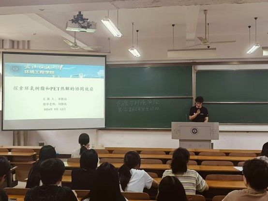 宋致远同学结合自身的研究内容,通过文献研究发现,环氧树脂的热解产物主要是芳香族化合物和气态碳氢化合物,而PET的热解则生成大量的小分子酯类和烃类。将两者共热解时,环氧树脂分解产生的活性中间体可以促进PET的降解,从而提高热解效率。此外,这种共热解可能会通过分解生成更多有价值的液态产物,如苯酚类化合物或碳氢化合物。该协同效应为混合废弃物资源化利用提供了新的思路,有助于提升工业废料处理效率并减少环境污染。