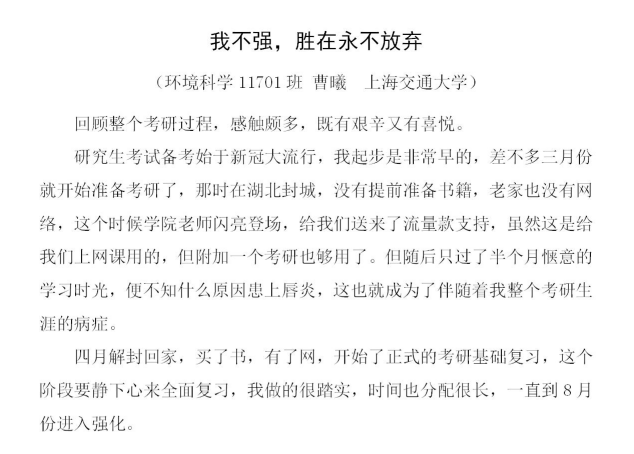 2.字数不限,建议1500字左右,毕竟考研战线长,经历丰富,复习经验并非三言两语可以说清(考研总体规划、复习经验参考、曲折故事与感悟等);