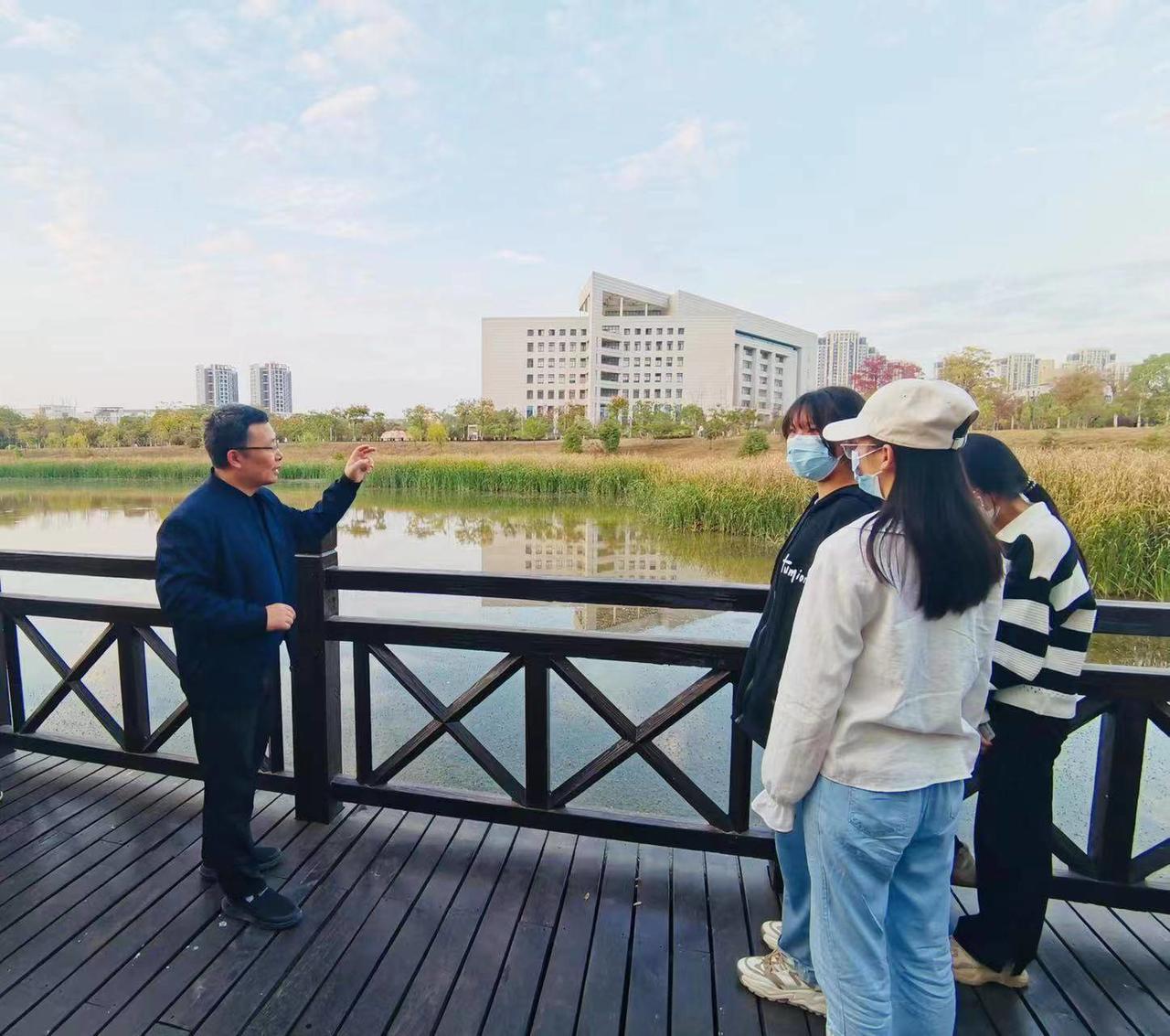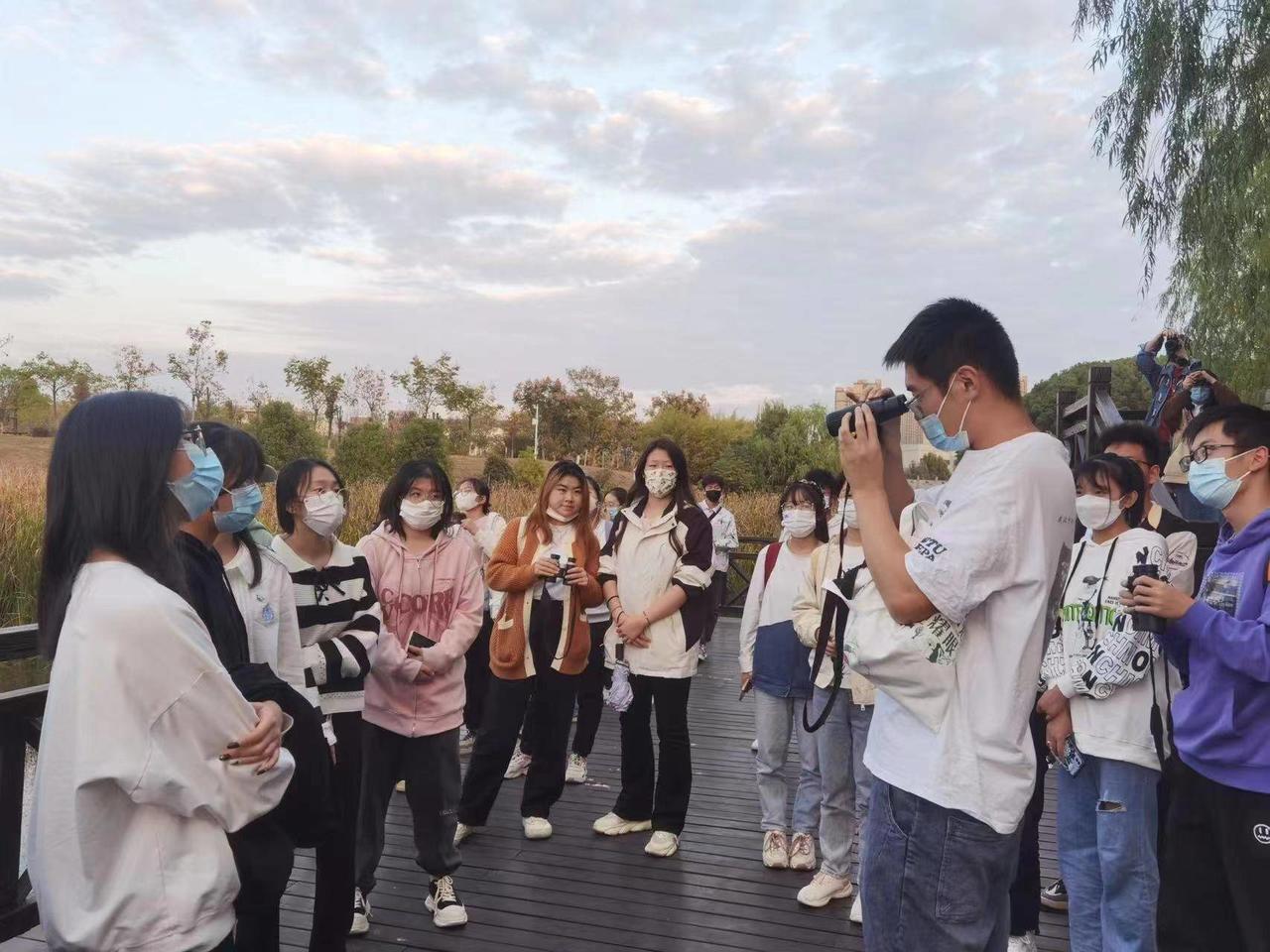 “流水如有意,暮禽相与还,同学们看夕阳下的中锦湖中要正在打盹的绿头鸭、枝头上有探头探脑的灰喜鹊,它们都是湿地生态系统中的组成部分。”11月8日下午,英国365集团网站英国365集团网站夏东升教授带领湿地保护志愿者50余人走进校园内的小微湿地开展观鸟、湿地巡护活动。