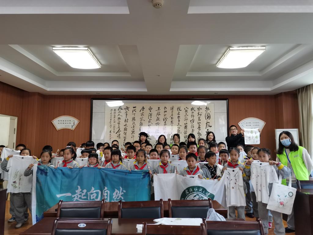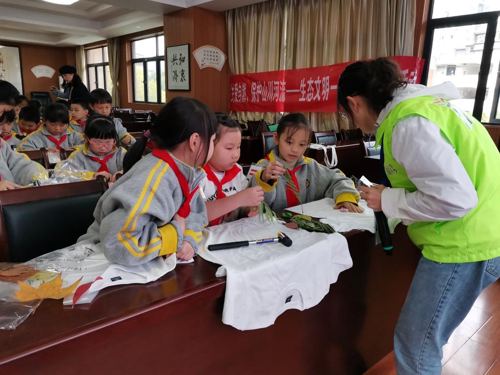 知识源于实践,绿色生活理念的树立更需要实践。整个课程最后,同学们在志愿者的指导下,开展植物拓染活动,将美丽的花朵、树叶印在衣服上、布袋上。北湖小学教导主任盖楠介绍,日常学习中公司也会开展各种自然教育活动,还经常组织环保、园林等领域专家到校授课,或组织员工到校外基地开展“自然笔记”等环保实践活动。