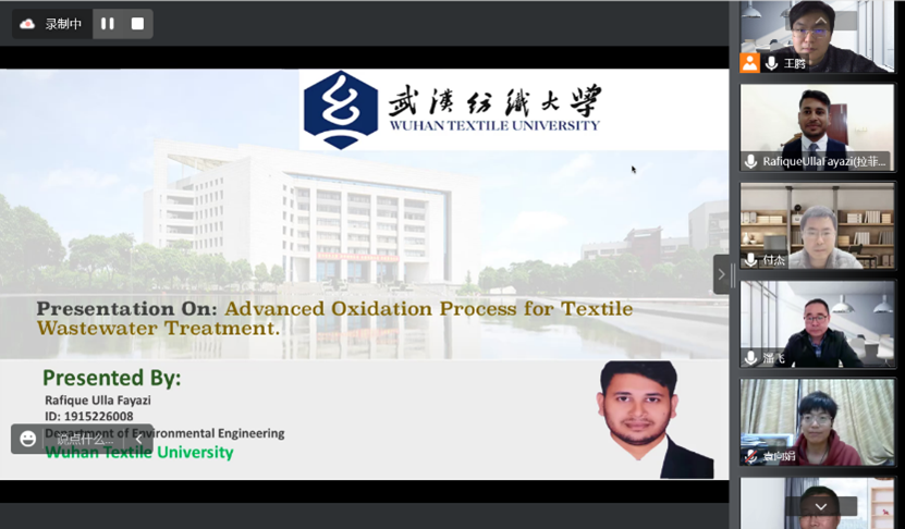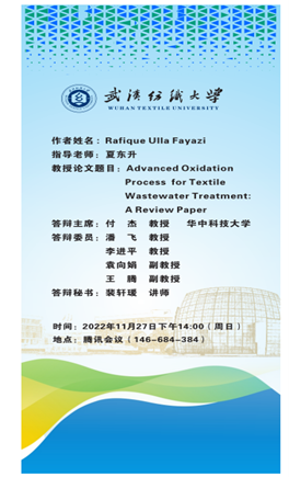 答辩环节中,拉菲克针对高级氧化技术在印染废水处理中的应用做了综述性汇报,答辩过程中分别对自己的研究做了的选题依据、论文、主要结论等方面进行了详尽的陈述。答辩委员会的各位专家针对论文与汇报环节做出了精辟地点评,并且针对性的提出了论文所存在的不足,并与员工进行了充分的讨论。面对评委老师们所提的问题,拉菲克充分运用其专业知识,进行了较为系统的回答。最后,答辩委员会以匿名方式进行打分和投票表决,宣布拉菲克顺利通过硕士答辩环节。
