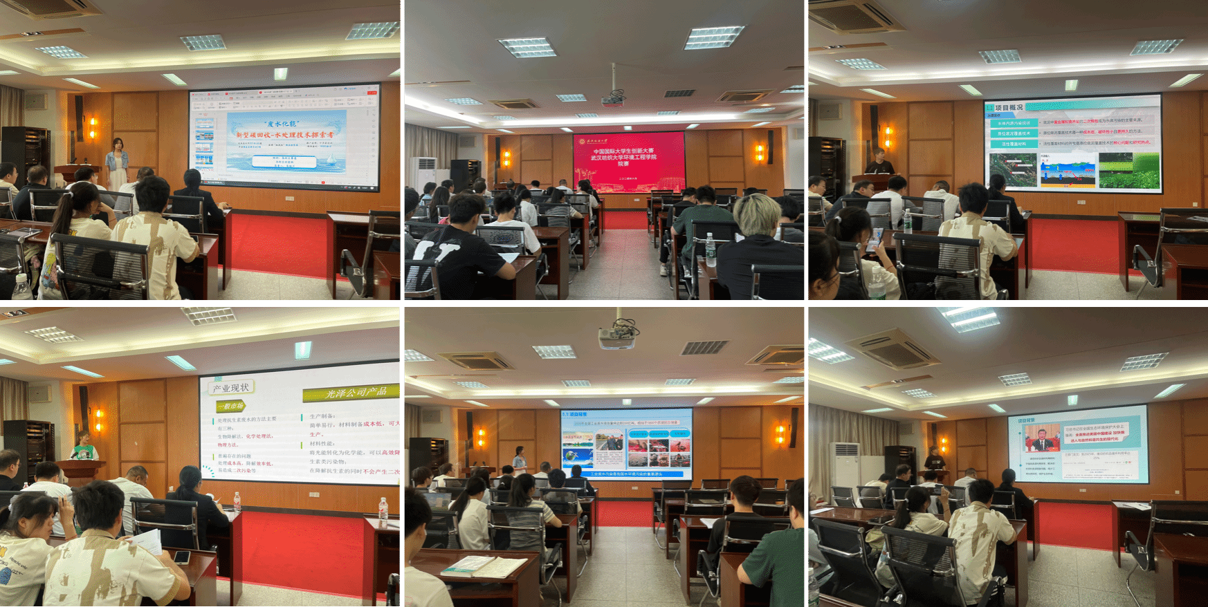 参赛团队依次上台从项目背景、产品/服务介绍、市场分析及定位、商业模式、营销策略、财务分析、风险控制、团队成员等多方面介绍自己的项目。朱晓兰团队介绍了一种新型碳回收-水处理技术、产品及装置,蔡煜炳团队介绍了一种铁基腐殖质土壤调理剂及其应用,李皓辰团队介绍了一种新型磁性多孔碳的制备及对养殖废水的高效处理反应器,崔勃研团队介绍了一种废旧苎麻纤维纺织品生物炭及其对染料废水的处理应用,朱玉樑团队介绍了一类固废基锁磷剂的制备及应用,刘梦林团队介绍了氮、氧双缺陷强化Z型Bi/Bi2O3/g-C3N4异质结光降解抗生素废水的机制研究,唐歆哲团队介绍了一种隧道火灾烟气运动状态预测技术,刘昊文团队介绍了一种可持续生物质复合水泥。