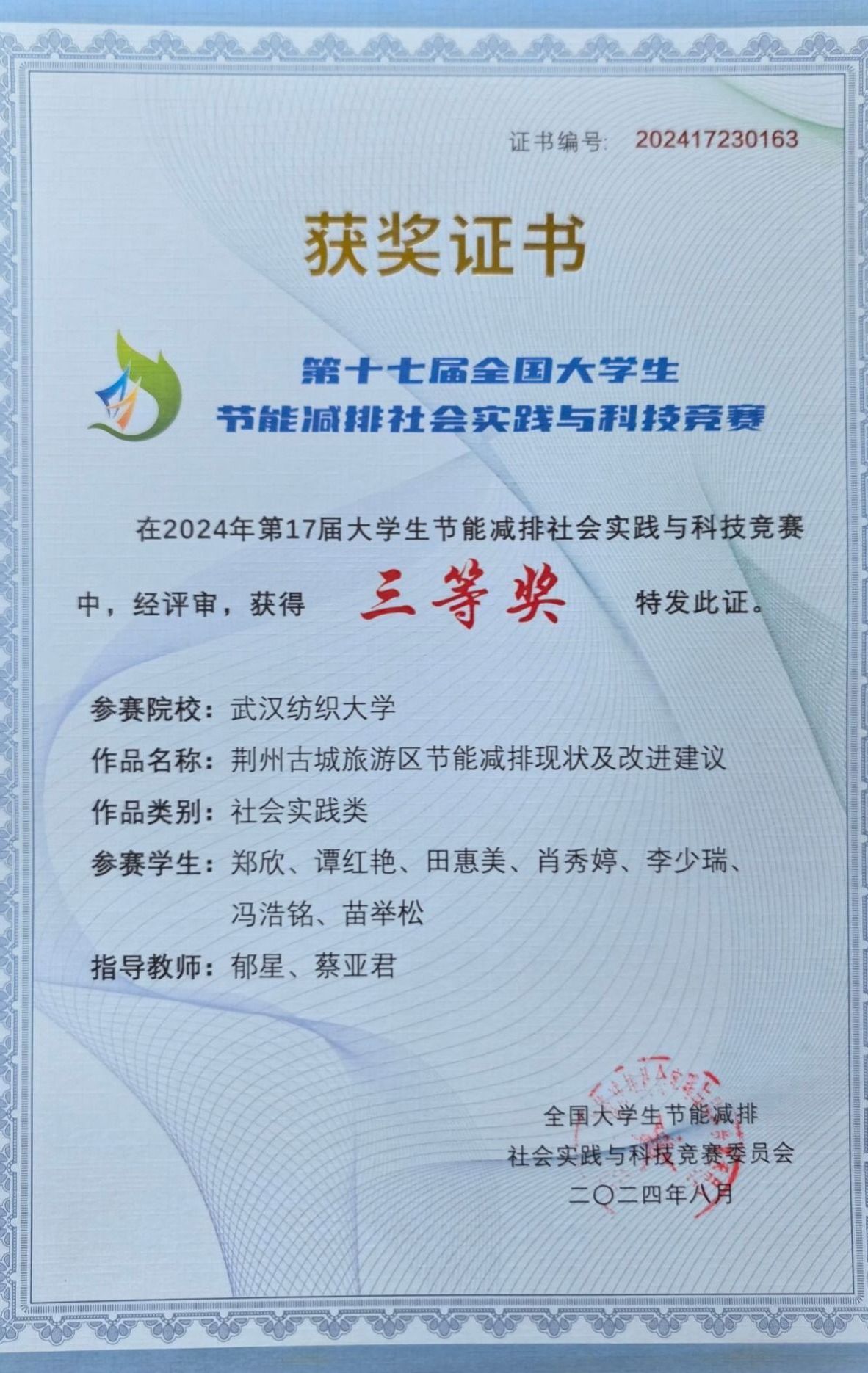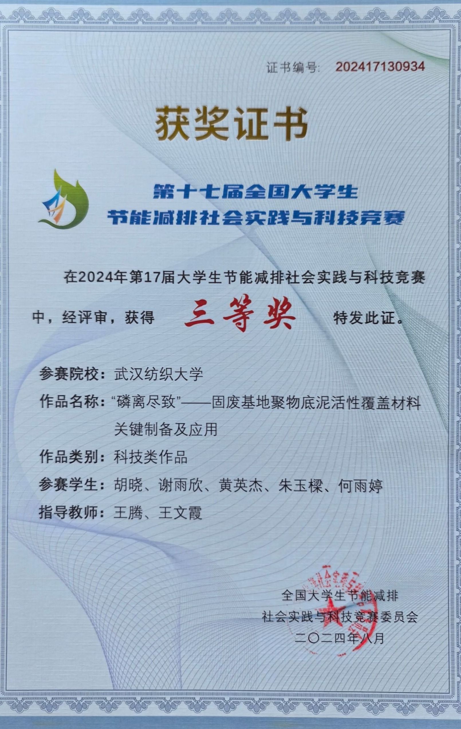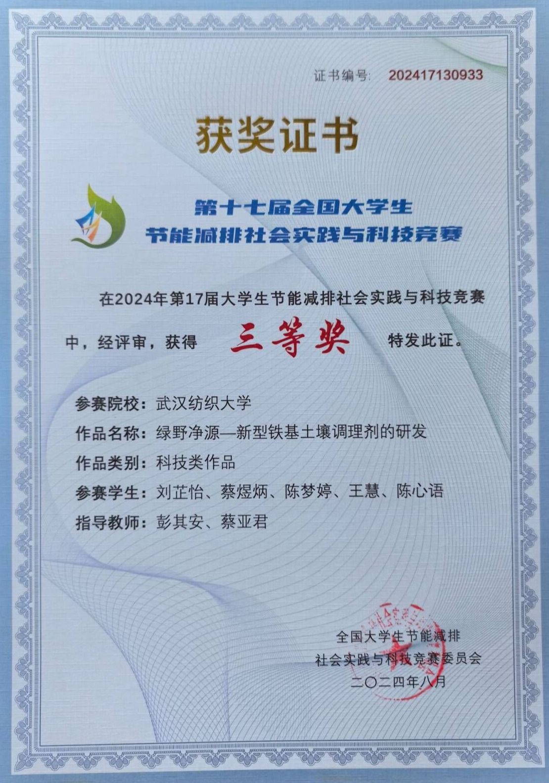 2024年8月19日,第十七届全国老员工节能减排社会实践与科技竞赛公布了获奖名单,我院环科12201班刘芷怡等作品《绿野净源—新型铁基土壤调理剂的研发》、环科12202胡晓等作品《“磷离尽致”—固废基地聚物底泥活性覆盖材料关键制备及应用》、环科12201郑欣等作品《荆州古城旅游区节能减排现状及改进建议》获得国家三等奖。
