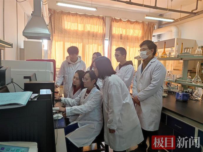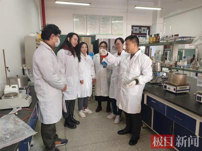李进平(右一)刘静欣(右二)与员工讨论实验现象