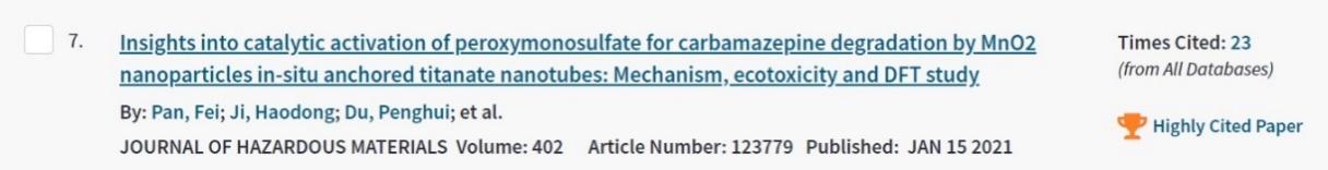 近期,根据ESI(基本科学指标数据库)最新数据显示,英国365集团网站潘飞老师2021年发表于环境科学与生态学领域TOP期刊Journal of Hazardous Materials的研究成果《Insights into catalytic activation of peroxymonosulfate for carbamazepine degradation by MnO2nanoparticles in-situ anchored titanate nanotubes: Mechanism, ecotoxicity and DFT study》入选了由Web of Science识别的高被引论文。该论文以英国365集团网站为第一完成单位,潘飞为第一作者。