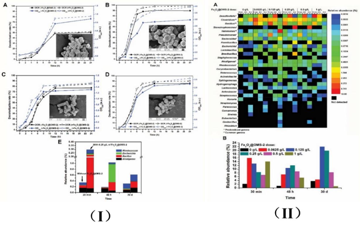 研究结果表明,添加0.25g/L的Fe3O4@OMS-2到SBR反应器后,一个循环周期(24h)内能提升至少20%的脱色率,采用Illumina MiSeq高通量测序技术分析SBR内部菌群结构,结果显示Fe3O4@OMS-2增加了菌群的总量和菌种多样性,而且更加重要的是,提升了菌群中可能降解染料的细菌数量;经过一系列的富集和分离纯化后,从活性污泥中筛选到4株菌种,经过16S rDNA序列鉴定后为Escherichia fergusonsi FP-D1,Rhodococcus ruber FP-E1,Bacillus aryabhattai FP-F1和Alcaligenes faecalis FP-G1;以上4株菌种在参与反应的好氧污泥中均存在,但是菌种在菌群中的丰度随着Fe3O4@OMS-2浓度的不同而改变,说明纳米催化剂Fe3O4@OMS-2的添加改变了好氧污泥中菌群的构成及其降解染料X-3B的能力;同时,菌种丰度的组成与菌群高通量测序的相关菌种相对应,验证了高通量测序的结果。