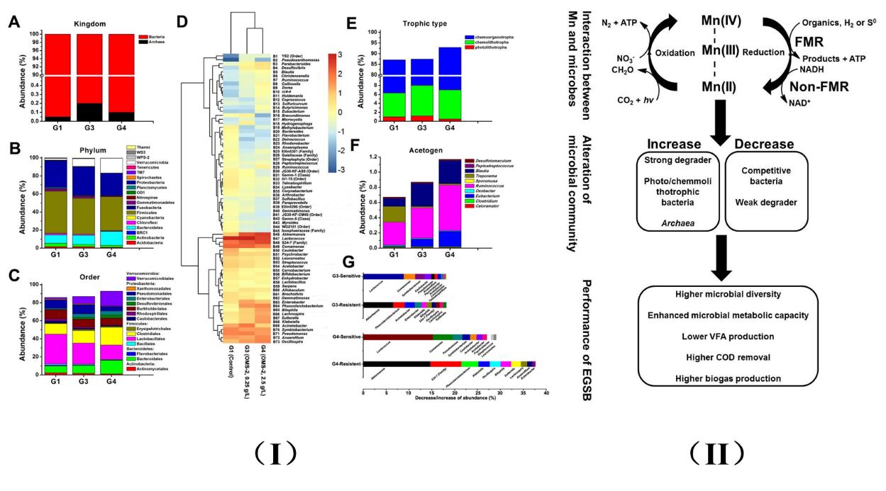 研究结果表明,低剂量OMS-2(0.025g/L)可以强化EGSB的运行效果,COD的去除率和反应器中生物量分别增加了4%和11%,同时,挥发性脂肪酸(Volatile fatty acid,VFA)降低了11%;采用Biolog ECO生态板检测EGSB内部菌群的新陈代谢水平显示OMS-2不仅提升了菌群的新陈代谢水平,而且明显改变了菌群的组成结构;采用Illumina MiSeq高通量测序技术分析EGSB内部菌群结构,结果显示OMS-2强化了菌群的多样性并且改变了菌群的组成结构,当EGSB反应器内部添加了0.25g/L的OMS-2后,菌群中所占比例最大的细菌属Lactococcus属(一类乳酸菌)的占比从29.3%下降到20.4%,这个改变可能导致了VFA的下降和菌群多样性的提升。OMS-2也增加了乙酸菌和古菌(Archaea)在菌群中的占比,同时提升了菌群的乙酸化作用和甲烷产生水平。X射线光电子能谱分析(XPS)结果表明,OMS-2在EGSB内部,Mn(IV)/Mn(III)被还原成Mn(II),这个反过来影响了EGSB内部的菌群。