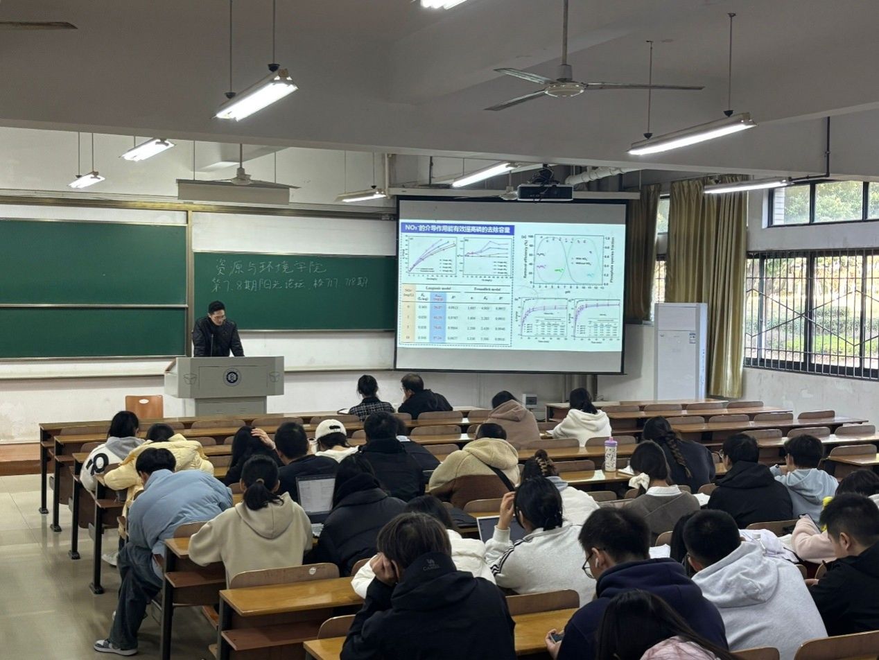 文志潘教授在报告中从氮/磷对水生生态的危害入手,讲到运用厌氧氨氧化的工艺能够有效简化水体脱氮的步骤,同时减少温室气体的产生。此外,针对水体除磷,他从自身的研究经历出发,运用蓝铁矿、累托石(REC)作为具有稳定骨架结构的矿物载体,与铁元素相结合,有效提升了水体除磷的效率。现场氛围热烈,报告结束后,参会师生针对讲座内容进行踊跃提问,文志潘教授对这些问题进行了细致解答。