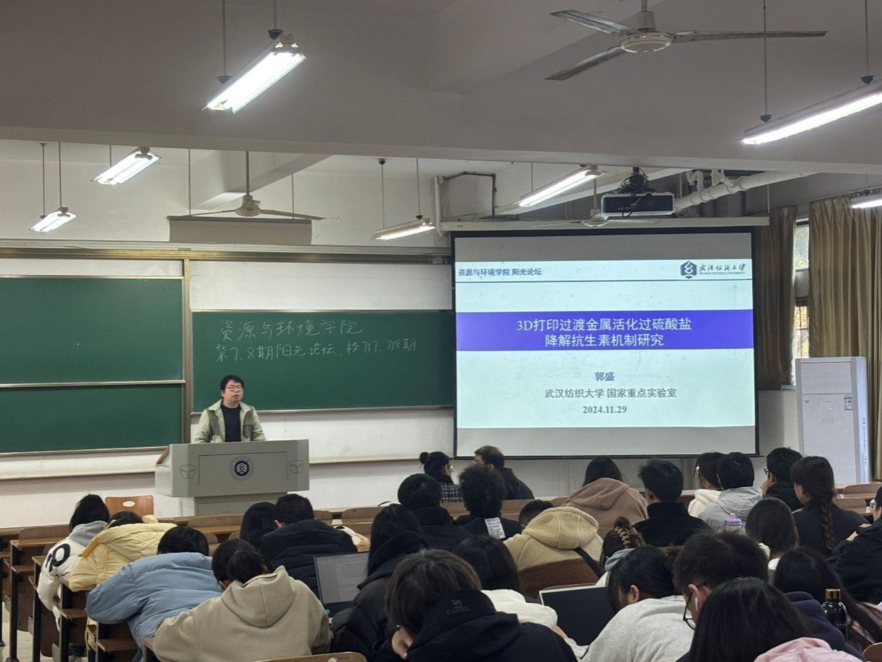 郭盛老师从近年来抗生素的使用逐渐频繁,其在水中的残留对水生生态构成的威胁出发,讲述了对比传统的芬顿技术,基于过硫酸盐的高级氧化技术能够更加有效的去除水体中的抗生素。在探索高效且环境友好的催化剂的过程中,郭老师运用3D打印技术,制备出高效稳定、容易回收的金属基催化材料,为在场的员工和教师提供了更加新颖的研究思路。现场氛围热烈,报告结束后,参会师生针对讲座内容进行踊跃提问,郭盛老师对这些问题进行了细致解答。