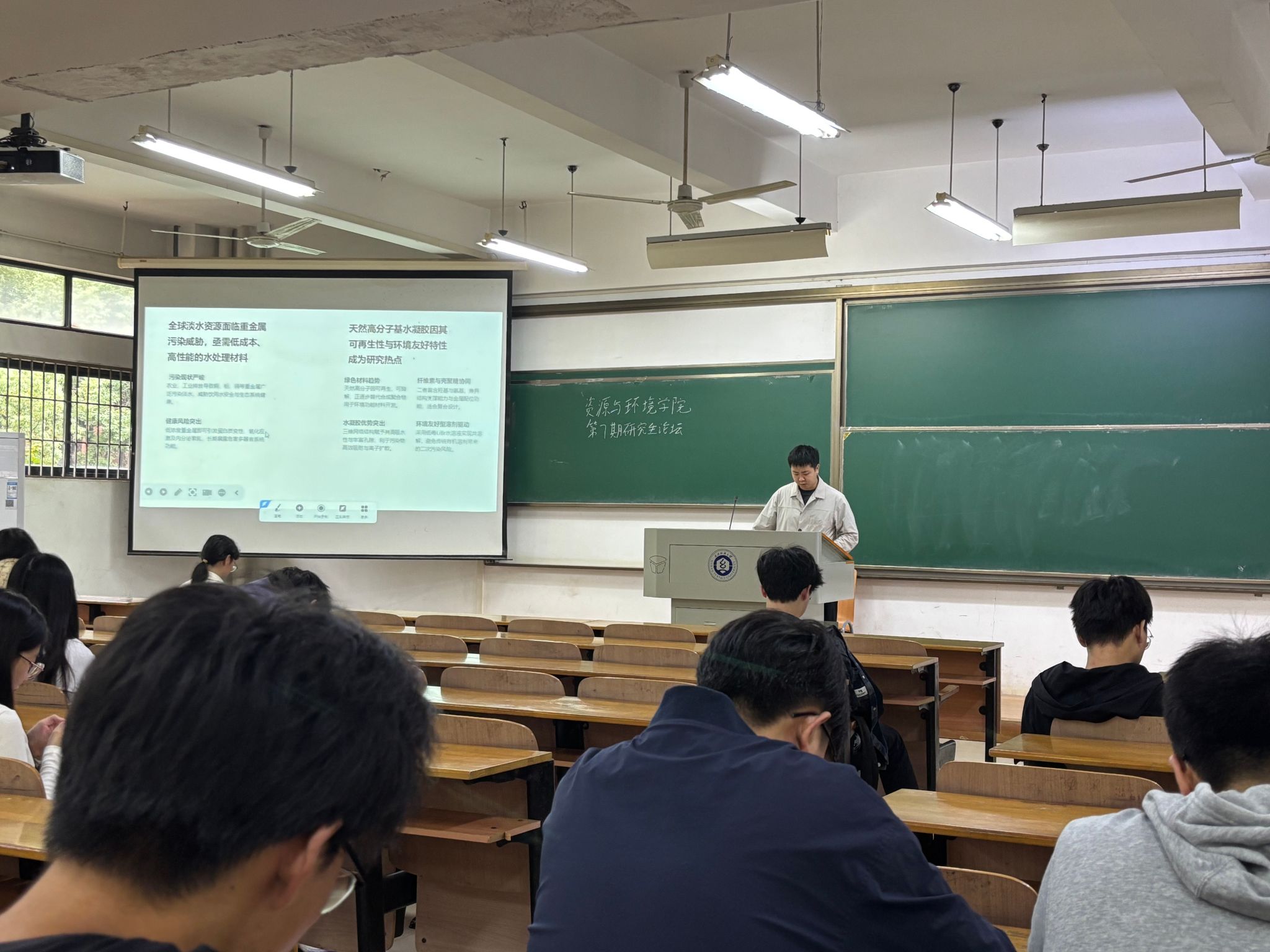 张义阳同学探讨了采用共溶再生法构建了介孔纤维素-壳聚糖复合水凝胶。讲解了该材料以LiBr为绿色溶剂,成功制备了具有高比表面积介孔结构复合水凝胶。并表现出Cu²⁺>Zn²⁺>Co²⁺的选择性吸附特性。该研究为重金属污染治理提供了一种绿色高效的新型吸附材料。