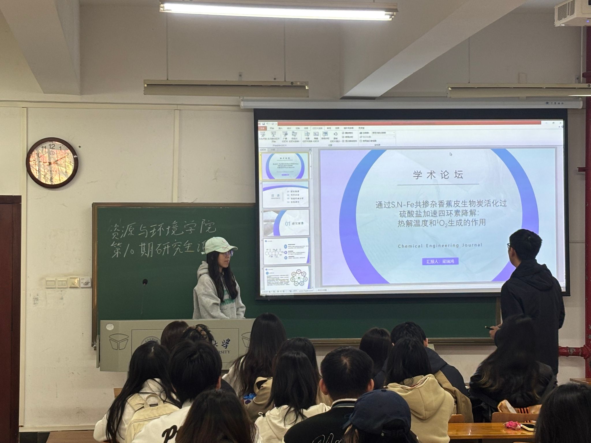 王慧茹同学探讨了该研究受自然光合作用启发,设计了由光诱导电子模块、电子转移通道模块和质子梯度模块组成的光驱动仿生系统。其核心是通过缺陷调控和能带结构工程等策略,实现NADPH和ATP的同步可控供应,解决微生物代谢中二者不足的问题。实验表明,该系统能显著提升沼泽红假单胞菌的CO2固定效率和番茄红素生物合成效率,电子转移效率高达90.8%,光子转化效率提升1.6倍。该系统还适用于大肠杆菌等菌株,为可持续生物制造、CO2减排提供了新路径。