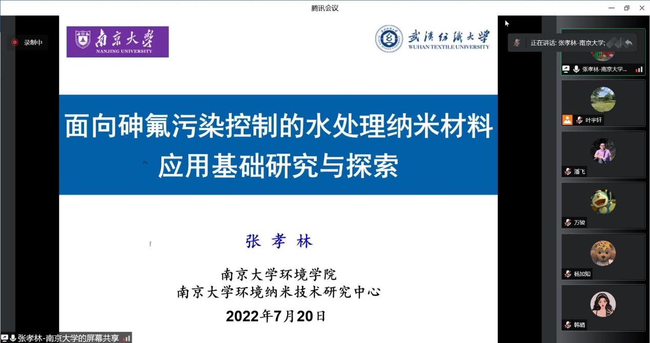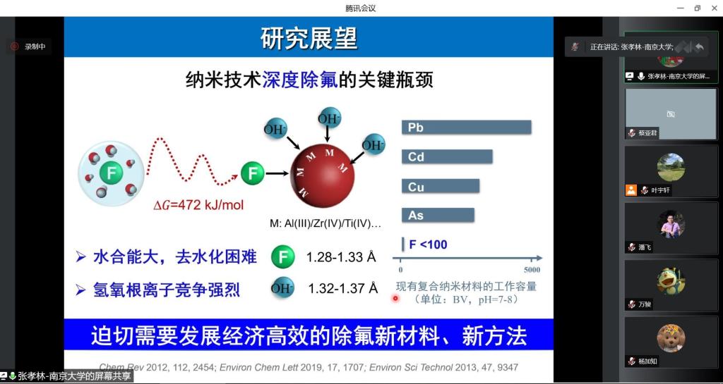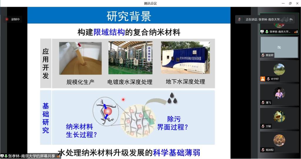 张孝林副教授首先分析了我国地下水和工业废水中砷氟污染现状,详细总结了该类水体的处理手段及难点。在谈到砷氟水体处理现存的问题时,他提出开发新型水处理功能材料是十分必要的,现有的复合纳米材料存在三方面的挑战,即纳米颗粒限域生长过程难以有效调控、纳米颗粒与污染物的限域作用特性不清以及共存基质对纳米材料深度除污过程干扰强烈。针对以上挑战,张孝林副教授课题组开发了一系列限域纳米材料,深入探究其除砷氟的限域特性及机制,构建功能耦合的抗干扰策略,最终实现了水体砷氟污染物的深度去除。该项研究已成功用于实际地下水和工业废水的处理,实现了一定规模的工程化应用。张孝林副教授还结合前期的研究,分享了未来即将开展的研究规划,为公司师生拓展研究思路、开阔学术视野提供了帮助。报告结束后,参会师生针对讲座内容进行踊跃提问,张孝林副教授对这些问题进行了细致解答。