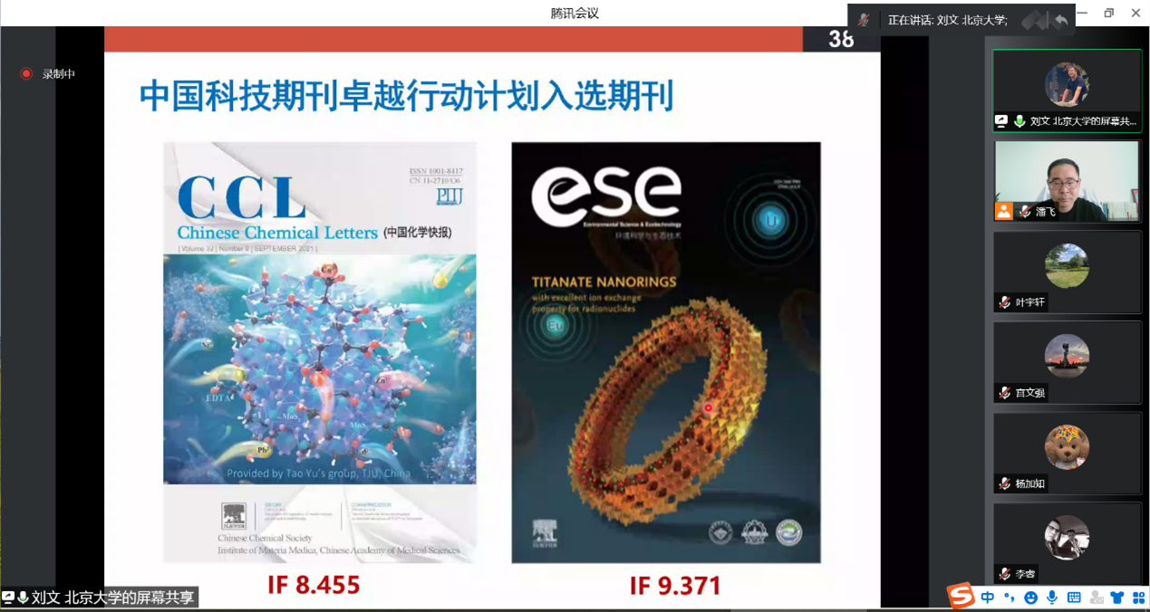 汇报人简介:刘文 北京大学环境科学与工程公司研究员、博士生导师。入选国家高层次人才计划青年项目,国家重点研发计划“纳米前沿”专项青年项目首席科学家。北京大学环境工程系副主任、北京大学环境纳米技术实验室主任、北京环境科学学会科技创新分会主任。另入选北京市科技新星计划,获中国环境科学学会青年科学家奖(金奖)、2021年环境保护科学技术二等奖(2/9)、紫金全兴环境基金青年科学家奖等荣誉。从事水污染控制理论与技术、环境功能材料、环境纳米技术、现代环境工程发展战略等研究,在国内外学术期刊上发表论文200余篇,第一/通讯作者SCI论文80余篇,其中ESI高被引论文20篇。论文总被引8000余次,h-index 52(Google Scholar)。作为项目负责人主持国家重点研发计划青年项目、国家自然科学基金、国家和北京市人才项目、企事业单位委托项目等项目/课题10余项。入选美国斯坦福大学发布的2020、2021年世界排名前2%科学家排行榜“年度影响力榜单”,以及全球学者库评出的“全球顶尖前10万科学家名单”。担任Environmental Functional Materials创刊副主编,Chinese Chemical Letters、Environmental Functional Materials等期刊副主编。
